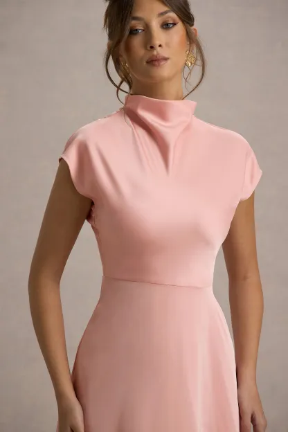 Our latest midi Velma guarantees to turn heads at every occasion. from formal dinners to garden parties. Crafted in our premium stretch satin in a gorgeous light pink hue. this piece features a high neckline draped hemline for a flattering silhouette. Pair yours with sleek stilettos for an elegant ensemble.
