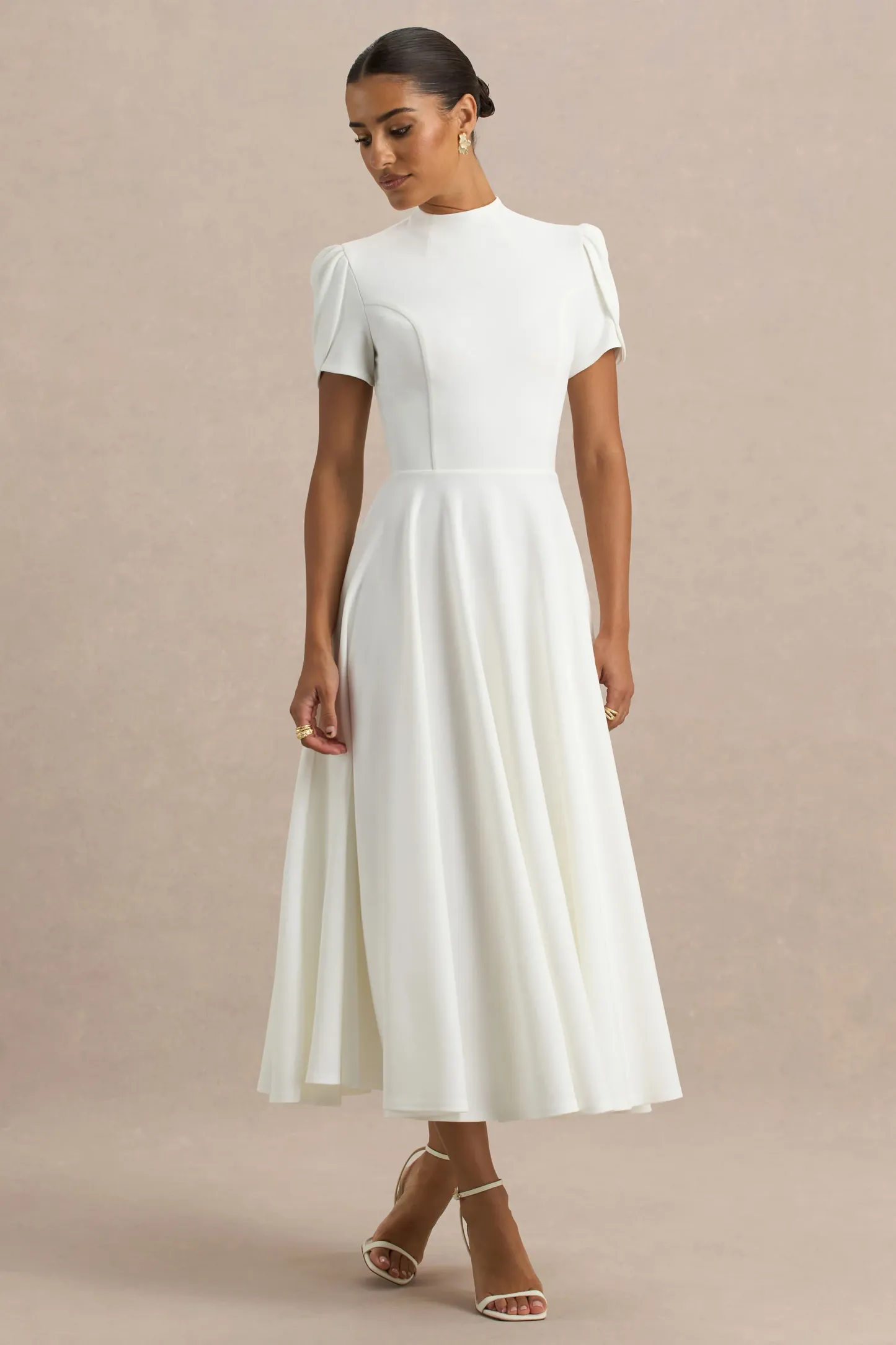 White High Neck Midi Dress With Puff Sleeves