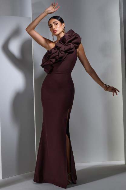 Steal the spotlight in this statement maxi. Vienne. Designed for high impact. this dark plum piece is characterised by an extravagant asymmetric neckline thats highlighted by an artful display of ruffles. Finished with a playful leg split. Vienne is fitting for any upcoming black tie event.