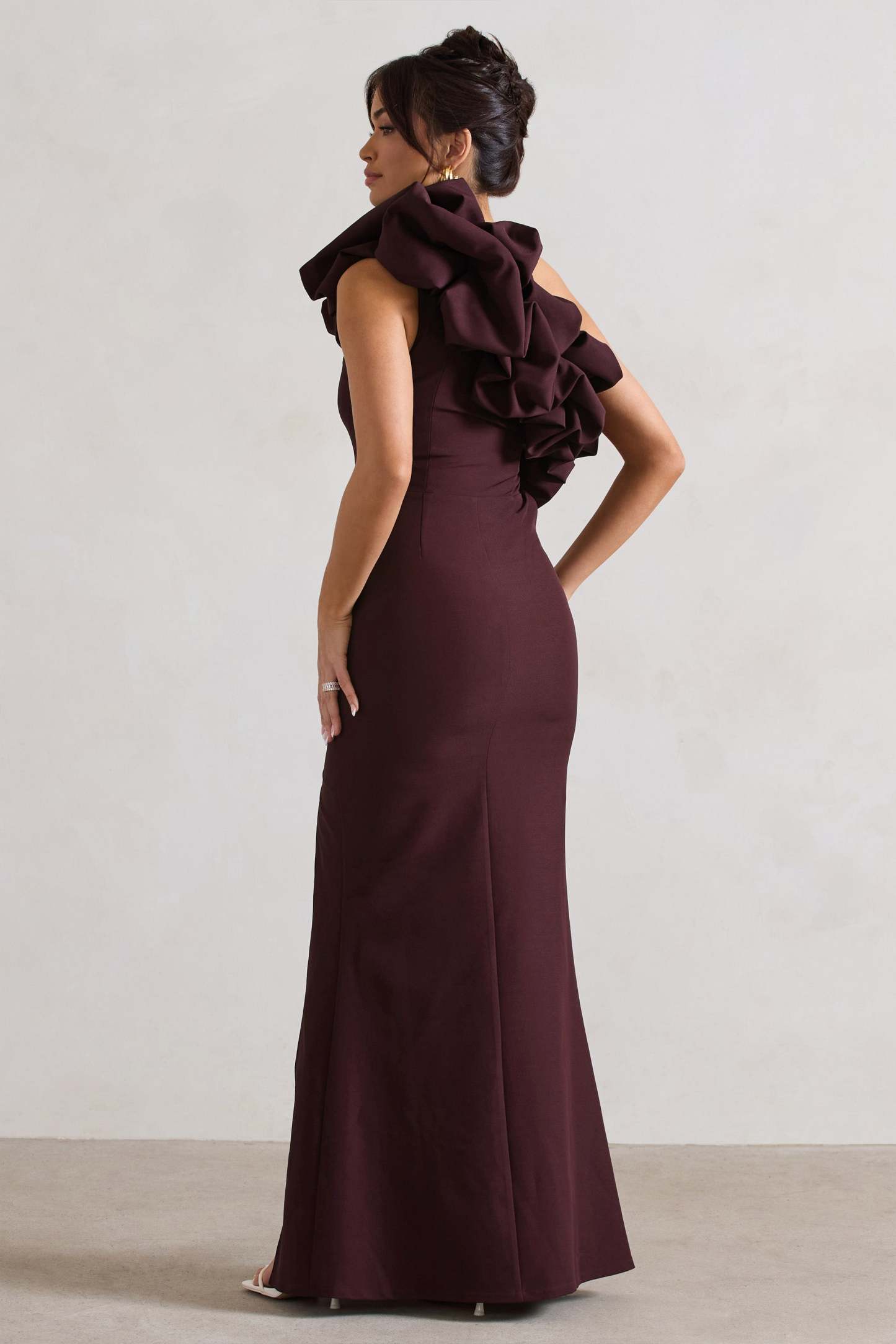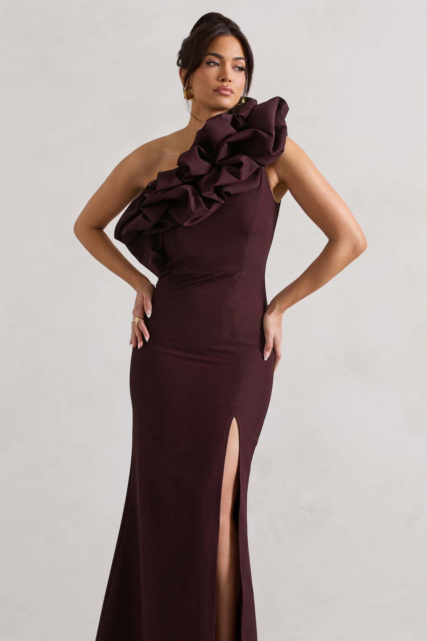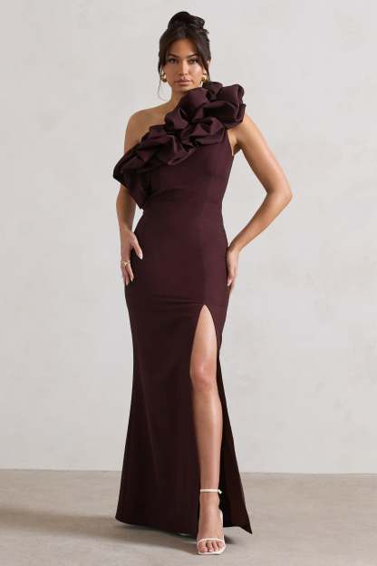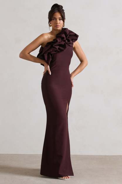 Vienne Dark Plum One Shoulder Ruffle Split Maxi Dress