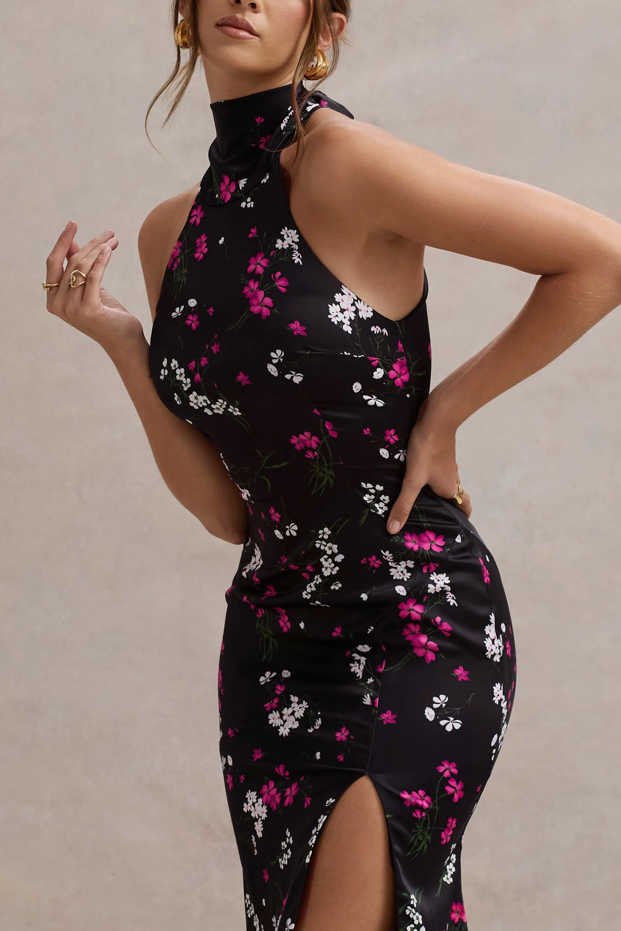 Black Ditsy Floral Print Satin High-Neck Split Midi Dress