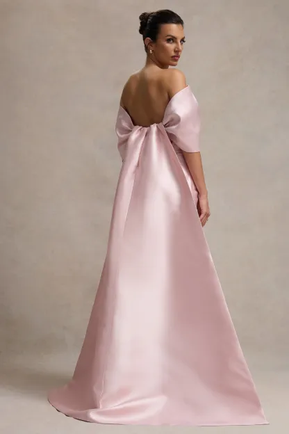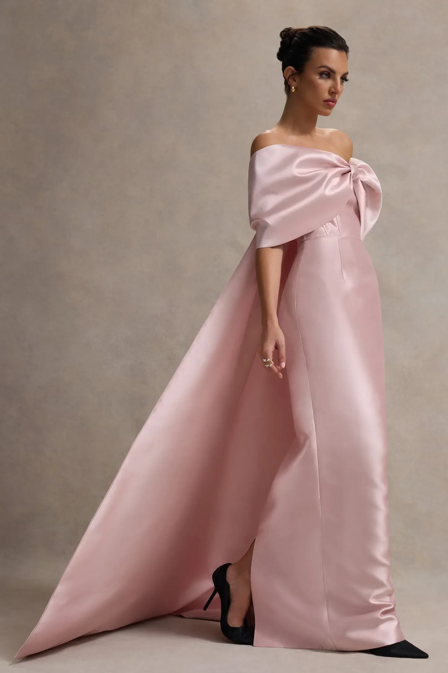 Indulge yourself in elegance this event season in our aptly-named maxi. Wanting More. Carefully crafted in a pretty pink shade of our signature satin. this formal piece is defined by a charming bow bardot and floor-length cape. The perfect black tie piece. compliment yours further with some sparkling accents like Abeam.
