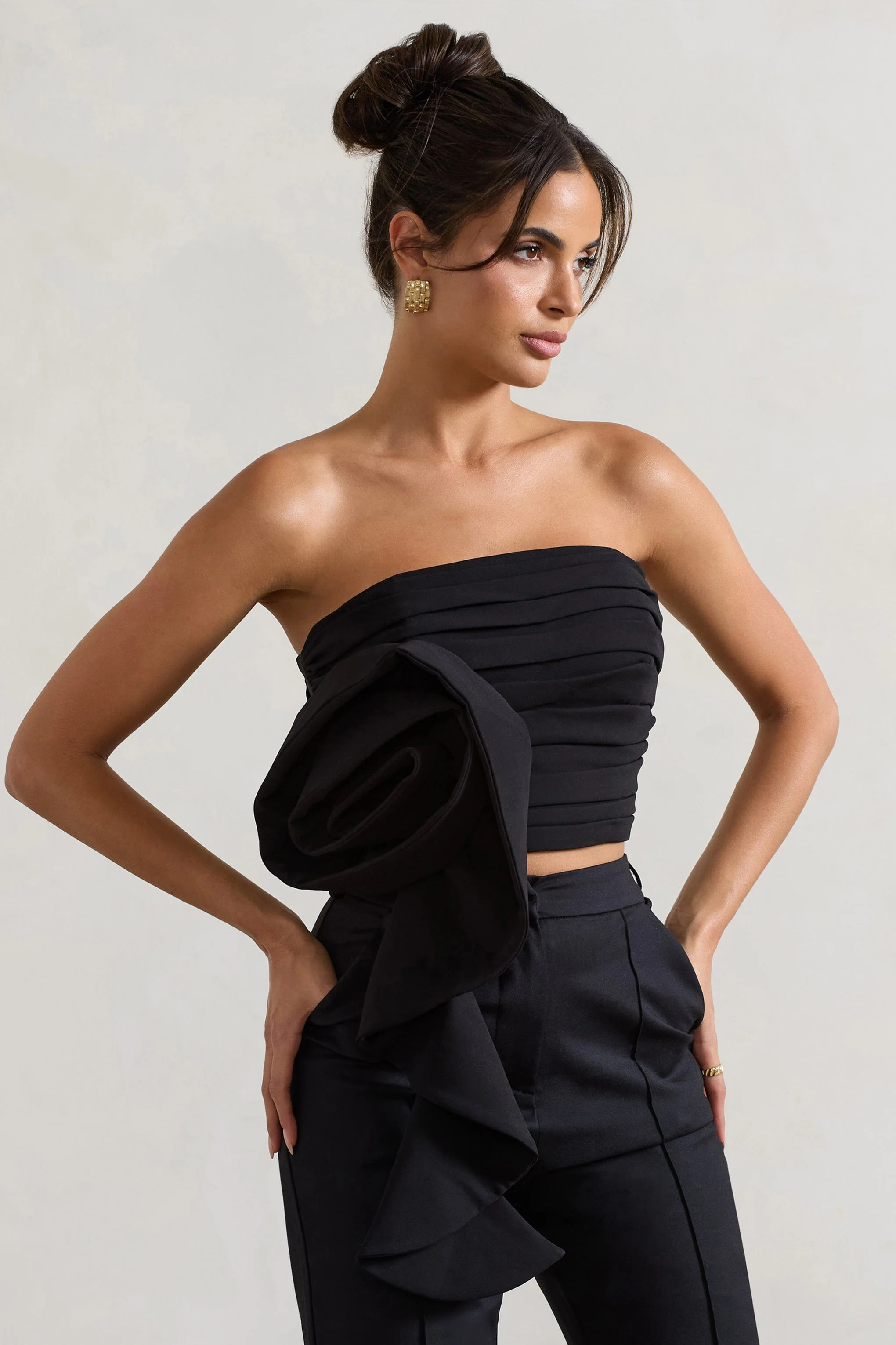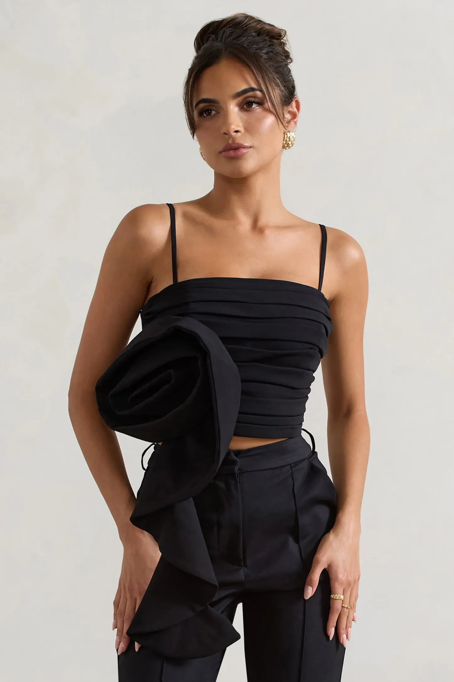 You name the occasion. we have the perfect top. Whirlwind has been carefully crafted in our signature stretch crepe boasting flattering ruching and detachable straps for a versatile finish. Complete with an oversized corsage thats placed along its side. keep this black crop top at the forefront by styling yours with a sleek bun and some gold accents.