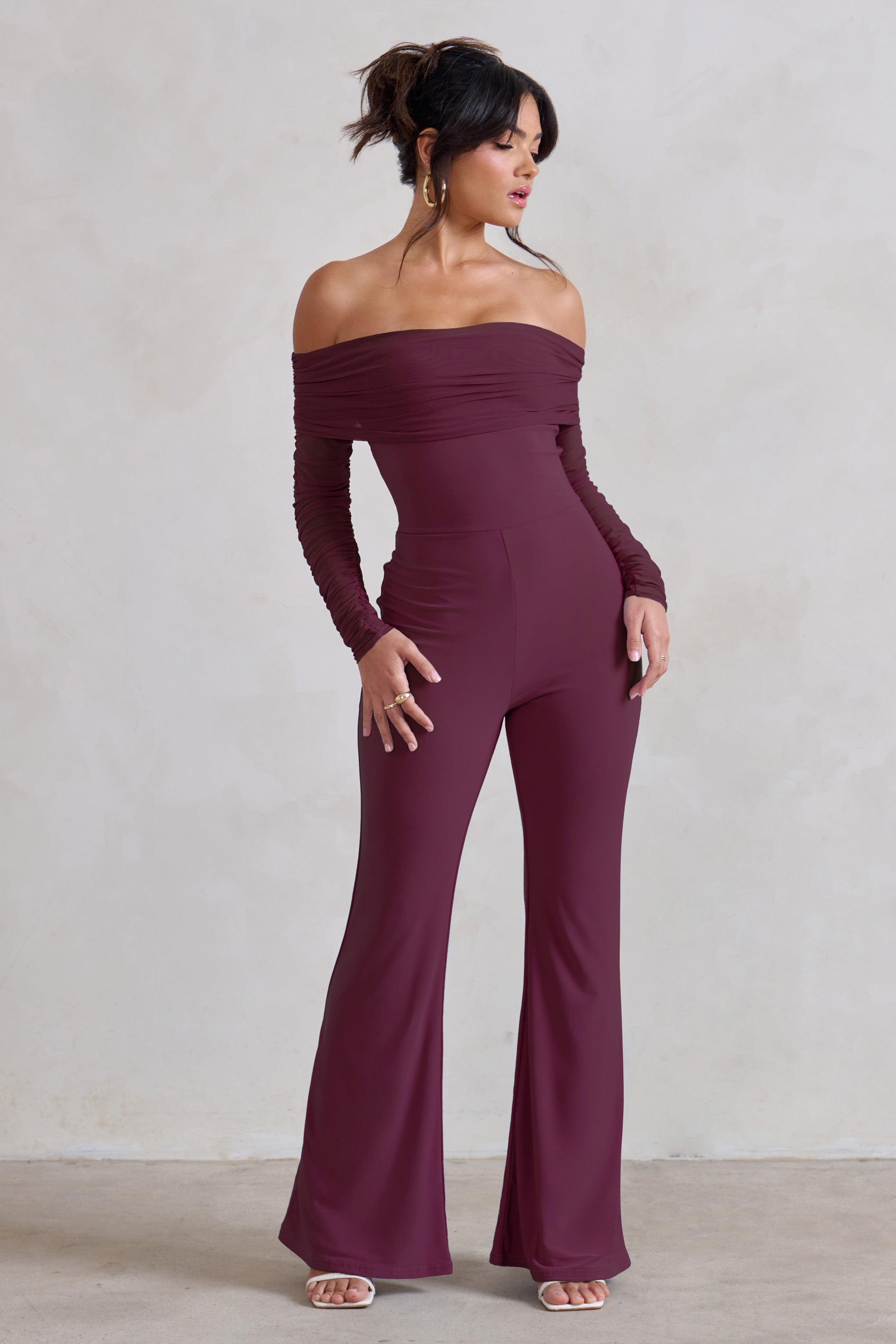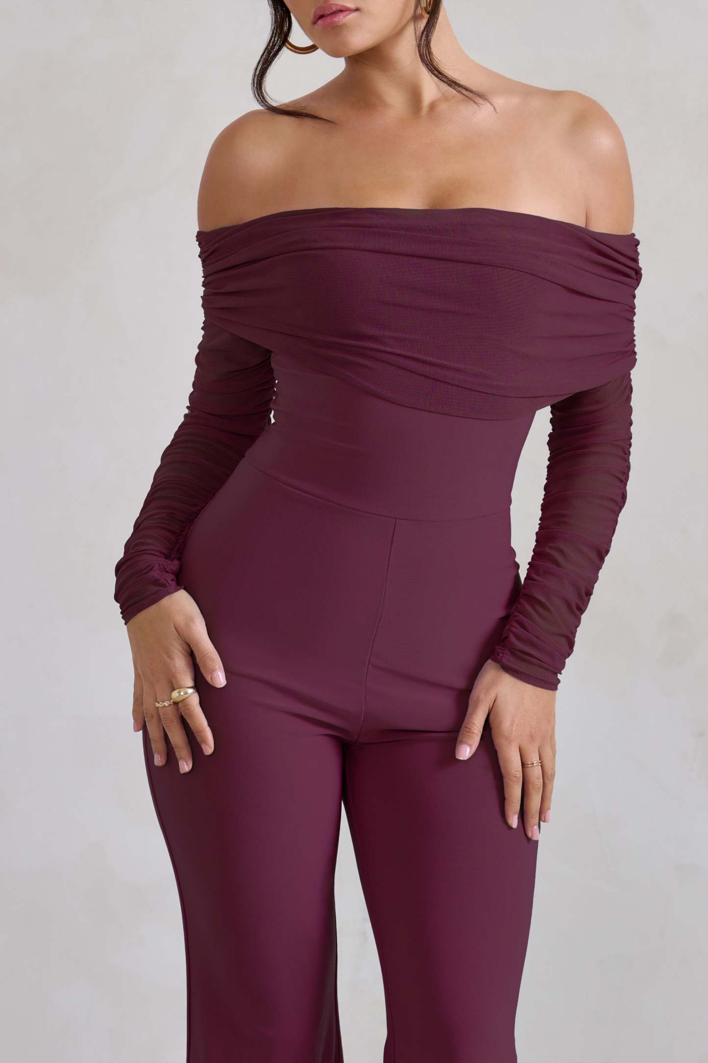 Whisper Burgundy Ruched Mesh Bardot Jumpsuit