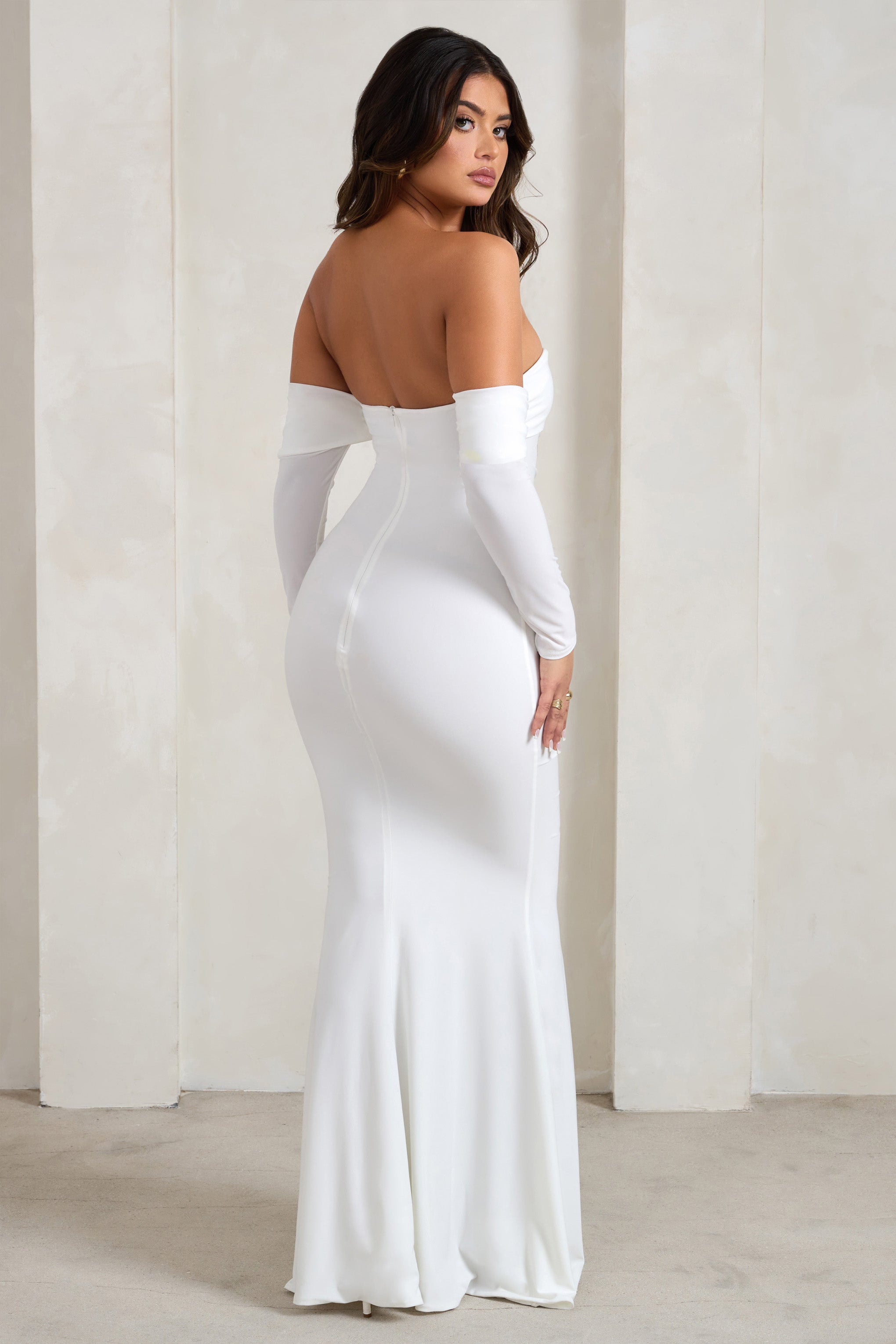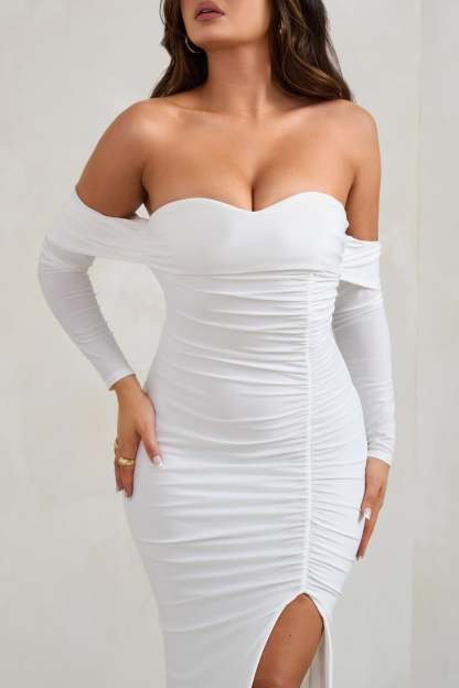 Stay on the party dancefloor long past midnight in our aptly-named Midnight maxi dress. Crafted luxuriously from our signature stretch jersey. this white gown boasts a draped silhouette with a beautifully ruched bodice and off-shoulder sleeves. Made all the more eye-catching by a split fishtail skirt. Midnight is the must-have for your next special occasion.