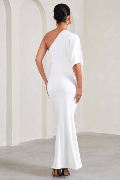 Sophisticated in both design and shape. this white maxi dress was designed to see you through any occasion. Cut from a smooth stretch jersey that clings to each curve. Wisdom is defined by an asymmetric neckline and elegant single sleeve. Accompanied by strappy stilettos. this maxi would make the perfect piece for any black tie event.