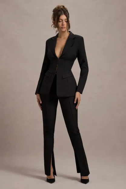 Destined for compliments. meet our bold Wonder Woman trousers in a classic black. a wardrobe staple to match every occasion. Featuring a high waist fit to elongate your beautiful silhouette with a straight leg and trendy split hem to make a statement. Cut from our premium crepe fabric. these trousers can be worn with an oversized t-shirt and trainers to run some errands looking cute. or with our beautiful Valeria crop top perfect for a girl's night out. Step in style on any occasion with this masterpiece!