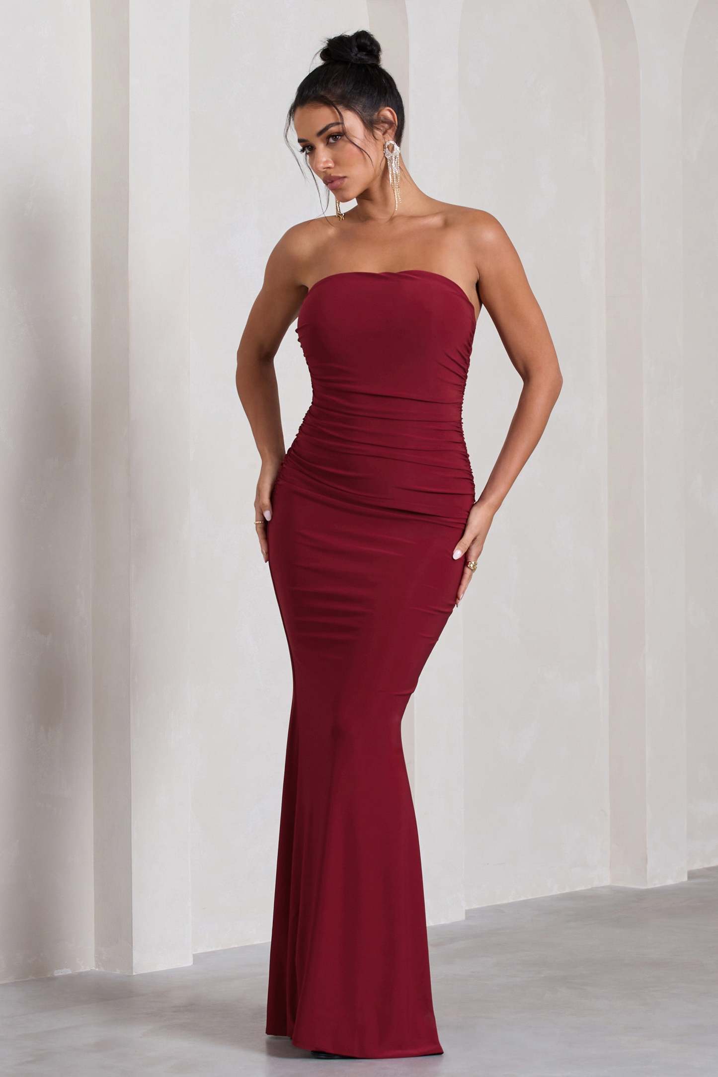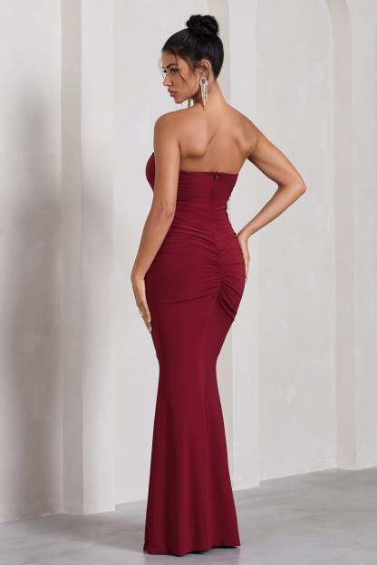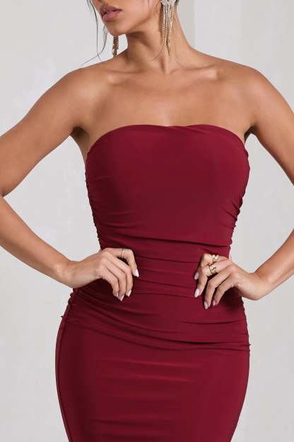 Every formal wardrobe needs a strapless staple like Wren. Arriving in a rich berry shade of our signature stretch jersey. this timeless maxi dress features a bandeau neckline. flattering ruching and elegant fishtail skirt. For a sophisticated black tie ensemble. try elevating this style by accessorising with its matching scarf Wrapped.