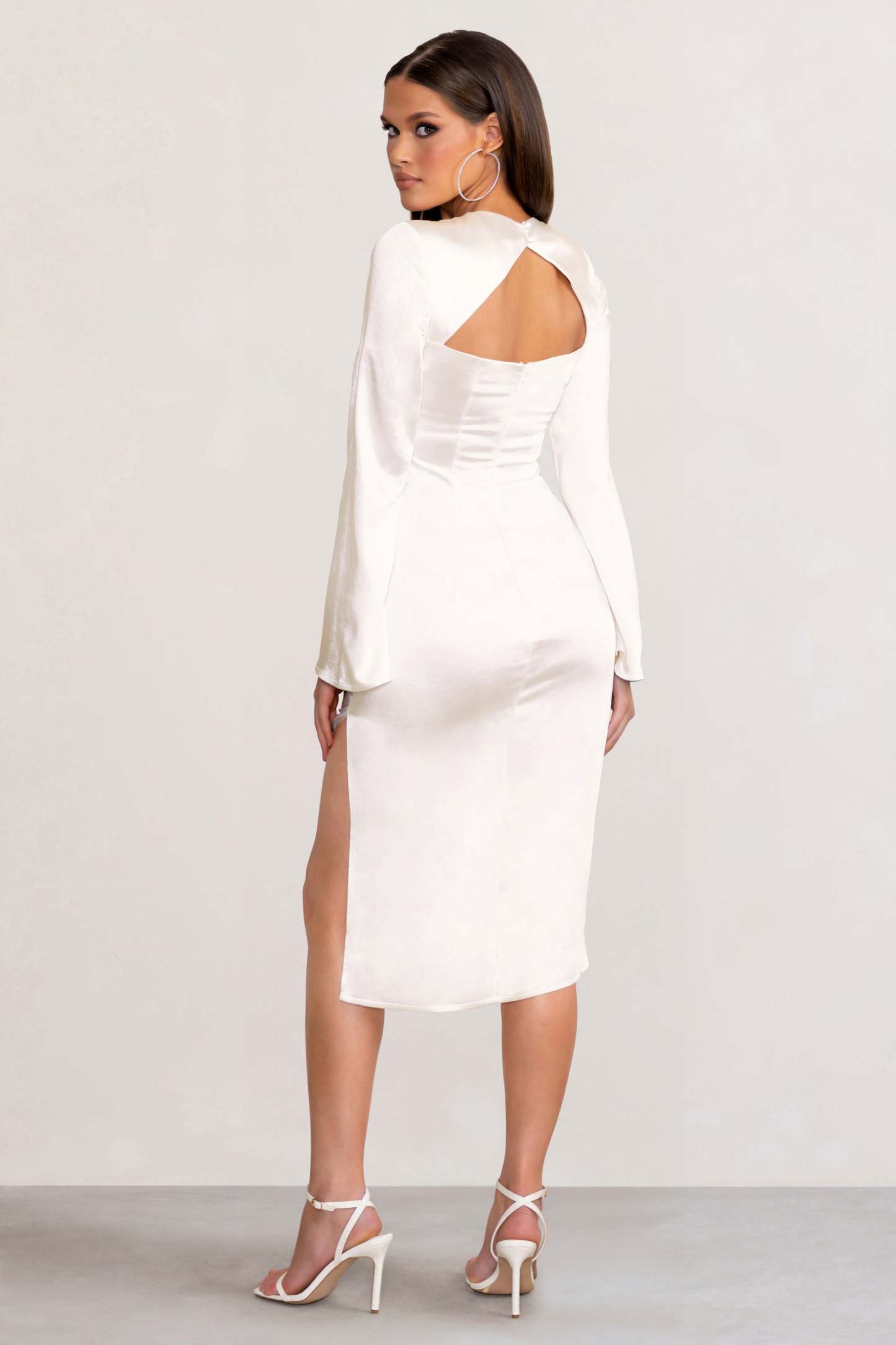 Zaina White Long Sleeve Midi Dress with High Neckline