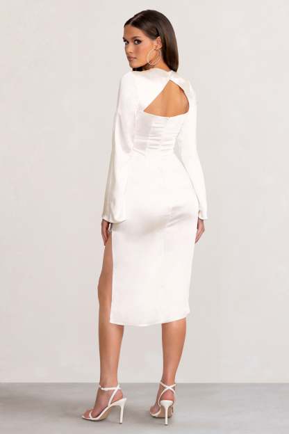 Striking the perfect balance between glamour and elegance. our stunning Zaina midi dress will fast become your new go-to for occasion dressing. Designed to flatter. this dress is constructed in a premium heavy satin with a triangle cut out back for modesty and elegance. The High neckline and long sleeves balance the subtle side split while the fitted sleeve flutes create that stylish look.