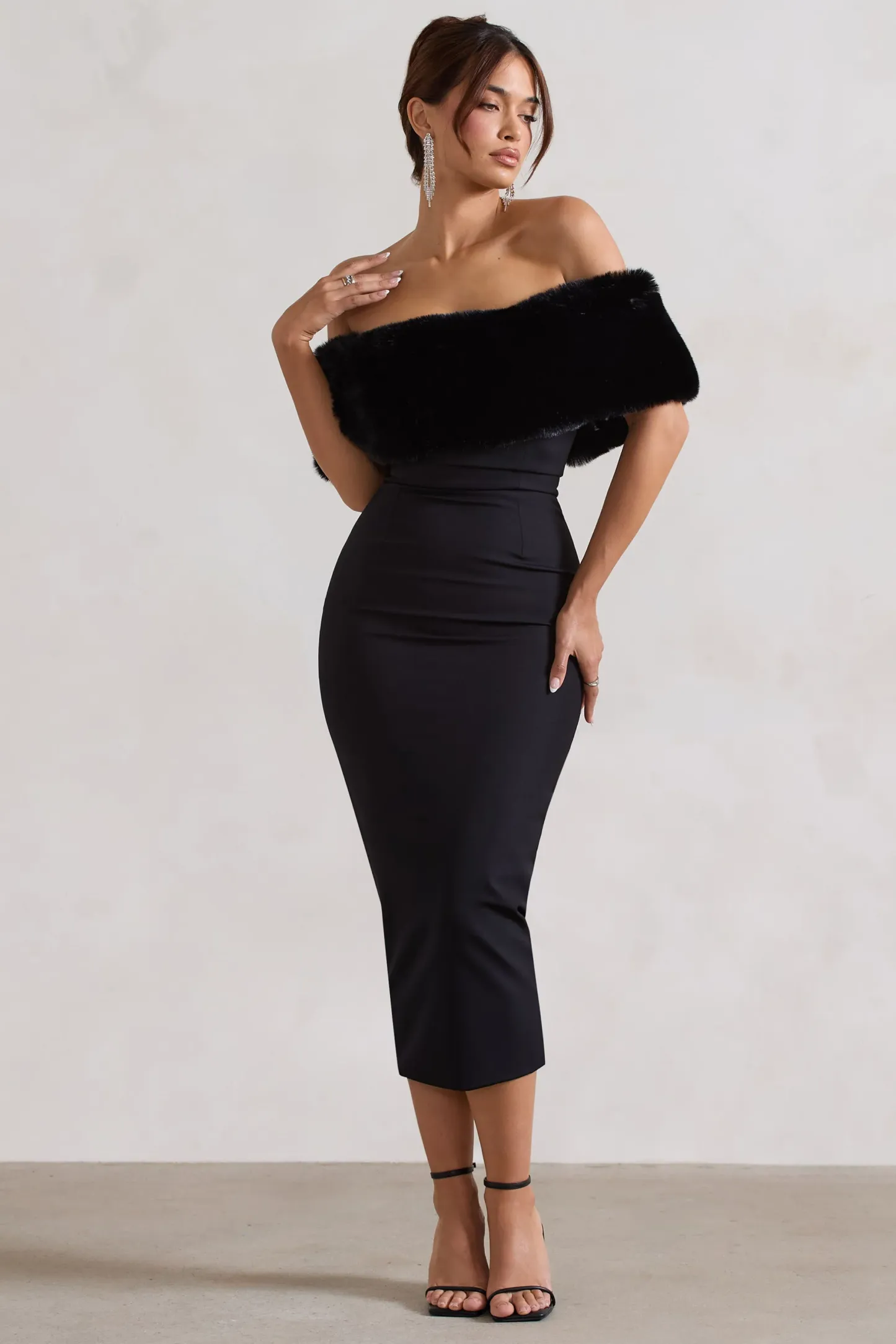 Indulge yourself in elegance with our lavish midi dress. Zia. Designed for special events. this LBD arrives in a bodycon silhouette of our premium stretch crepe equipped with a functional split hemline. Boasting a luxurious fur-trimmed neckline. keep Zia at the forefront with a sleek bun this event season.